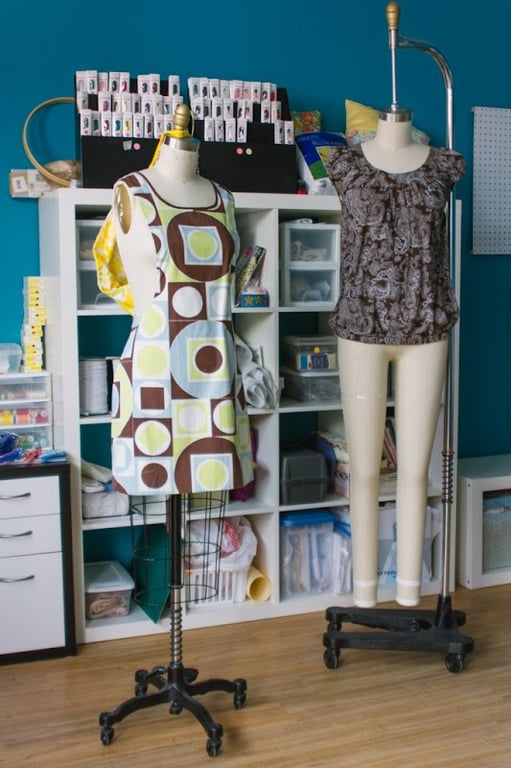 The image shows a vibrant sewing studio with two dress forms displaying colorful garments.