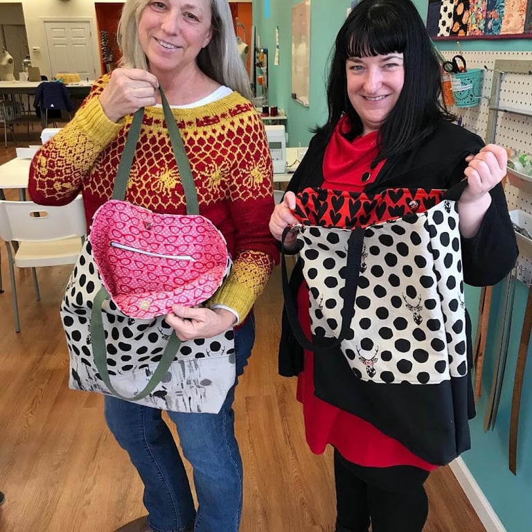 Two women proudly display their handmade bags in a bright, inviting sewing studio.