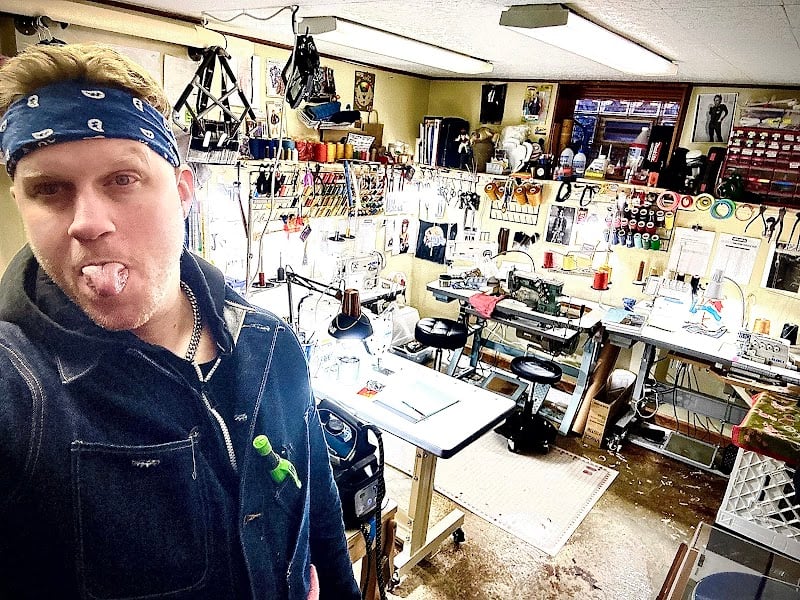 The image shows a vibrant sewing workshop filled with various sewing machines, colorful spools of thread, and organized tools on the walls.
