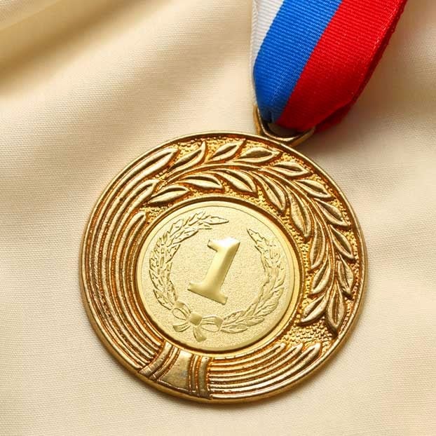 The image features a gold medal with a "1" in the center, surrounded by a laurel wreath design. It is attached to a ribbon with red, white, and blue stripes.