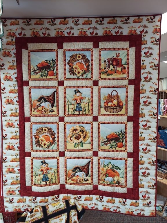 The image showcases a vibrant quilt displayed in a sewing store, featuring autumn-themed squares with pumpkins, sunflowers, and a scarecrow.