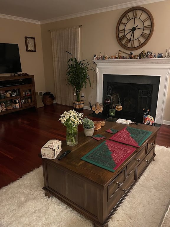 The image shows a cozy living room with a wooden coffee table displaying colorful quilted table runners and a vase of flowers.