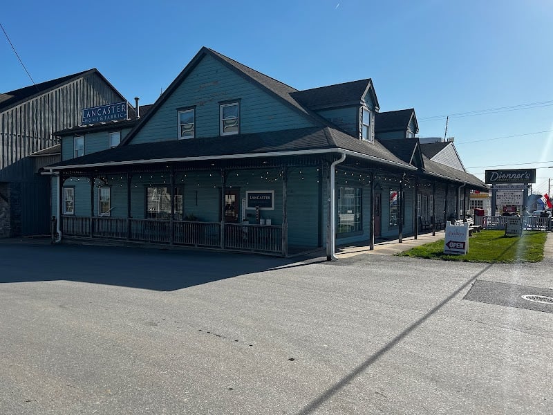 The image shows the exterior of Lancaster Home & Fabric, a charming sewing store with a blue facade and welcoming porch.