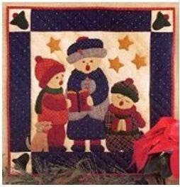The image features a festive quilt display showcasing three cheerful snowmen in winter attire, surrounded by stars.