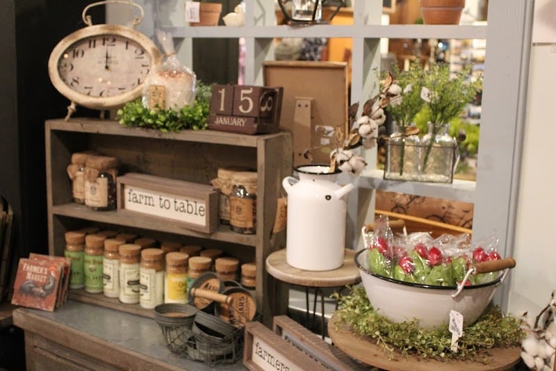 The image showcases a cozy interior of Lancaster Home & Fabric, featuring rustic shelving filled with jars, decorative items, and a white pitcher.