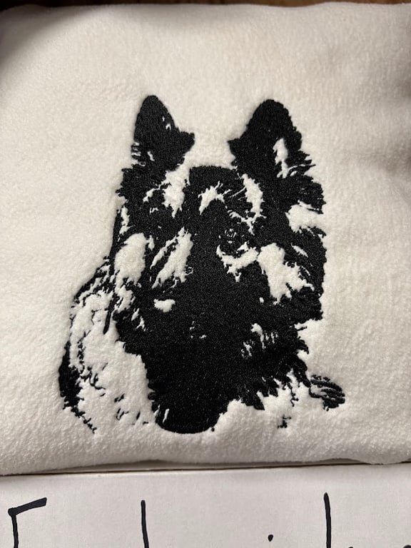 The image features a close-up of a black and white embroidered design of a dog's face on soft fabric.