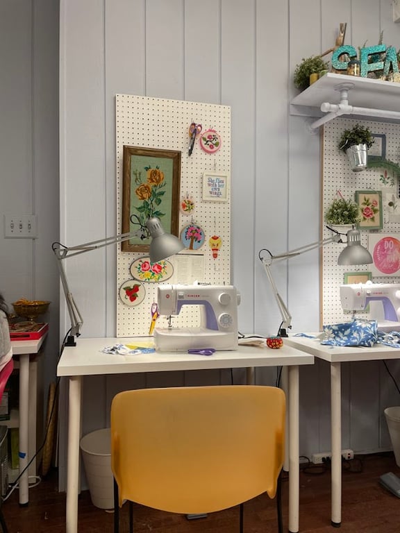 The image shows a cozy sewing studio with two well-lit workstations featuring sewing machines and colorful fabrics.