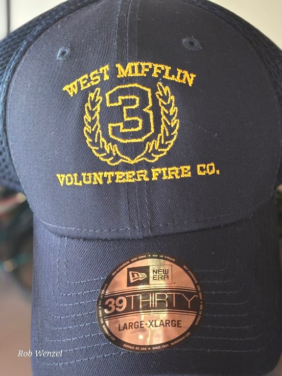 The image features a navy blue cap with yellow embroidery displaying "West Mifflin Volunteer Fire Co." and the number "3.