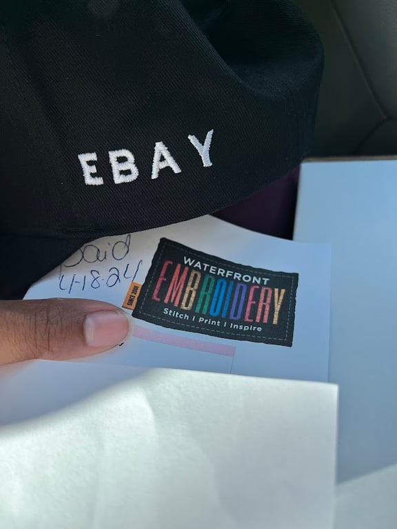 A black cap with "EBAY" embroidered on it is shown alongside a hand holding a business card for Waterfront Embroidery.