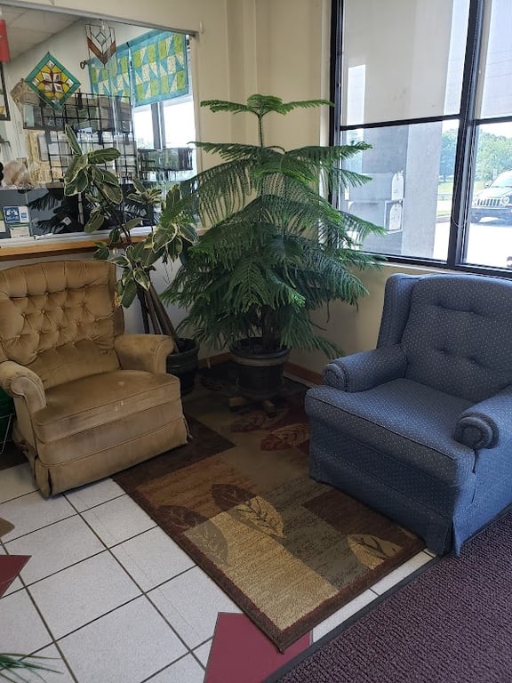 The image shows a cozy corner of In Stitches Quilt Shop, featuring two comfortable chairs and a lush plant.