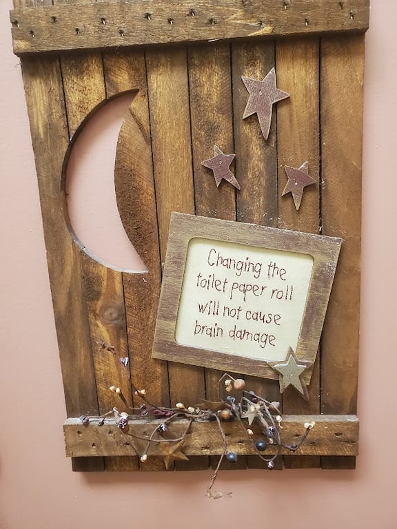 The image features a rustic wooden sign with a humorous message about changing toilet paper rolls, adorned with stars and a crescent moon.