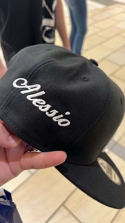 A person holds a black cap featuring the embroidered name "Alessio." The background shows a bright, tiled store interior, suggesting a lively shopping environment.