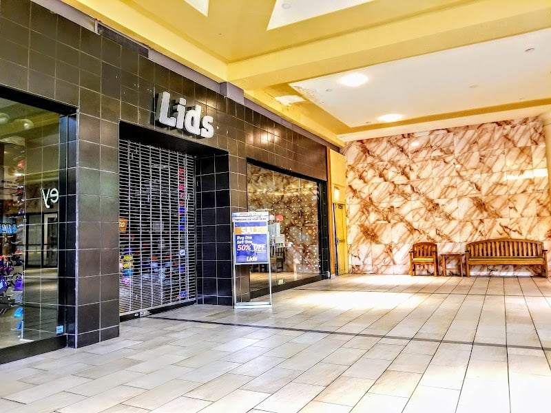 The image shows the exterior of a Lids store in a mall, featuring a sleek black facade and a display of sports caps.