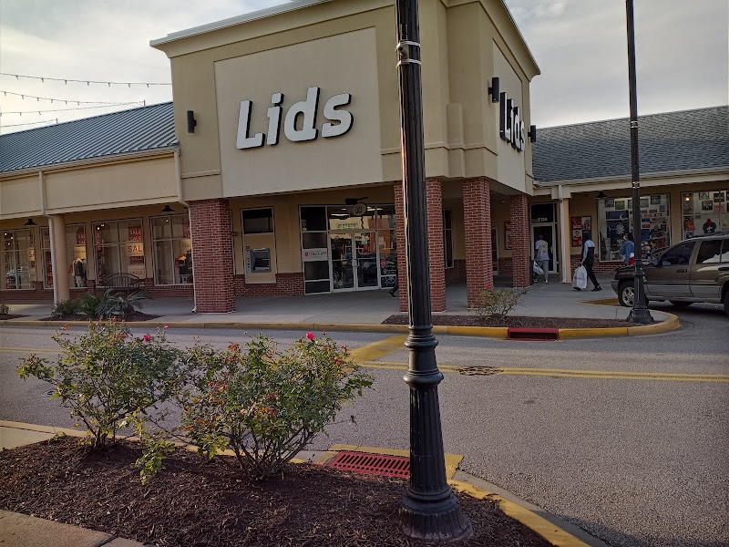 The image shows the storefront of Lids, a retail shop featuring a variety of hats displayed on shelves.