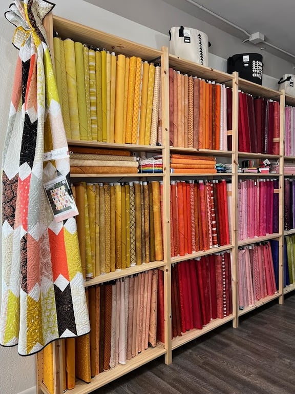 The image showcases the interior of Coneflower Quilt Co, featuring vibrant fabric rolls neatly displayed on shelves.