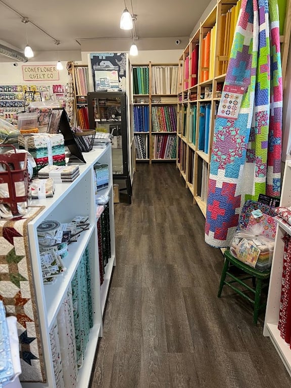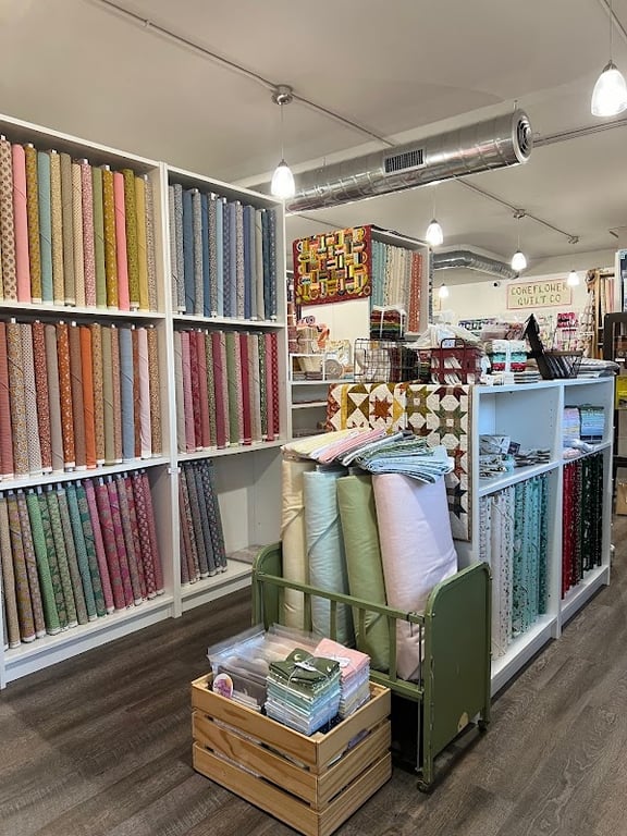 The image shows the interior of Coneflower Quilt Co, featuring neatly arranged shelves filled with colorful fabric rolls in various patterns.