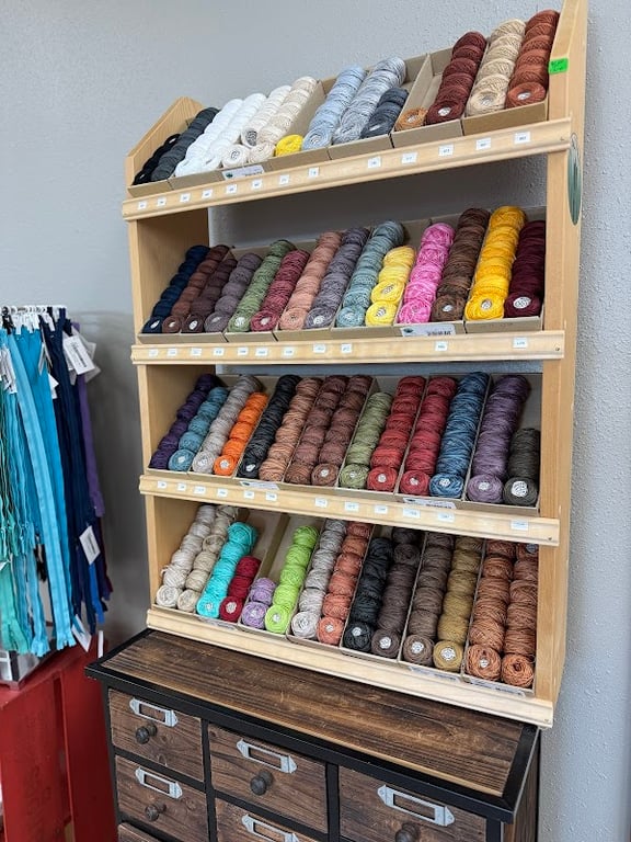The image showcases a well-organized display of colorful spools of thread on wooden shelves at Dutch Rose Quilt Shop.