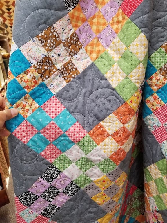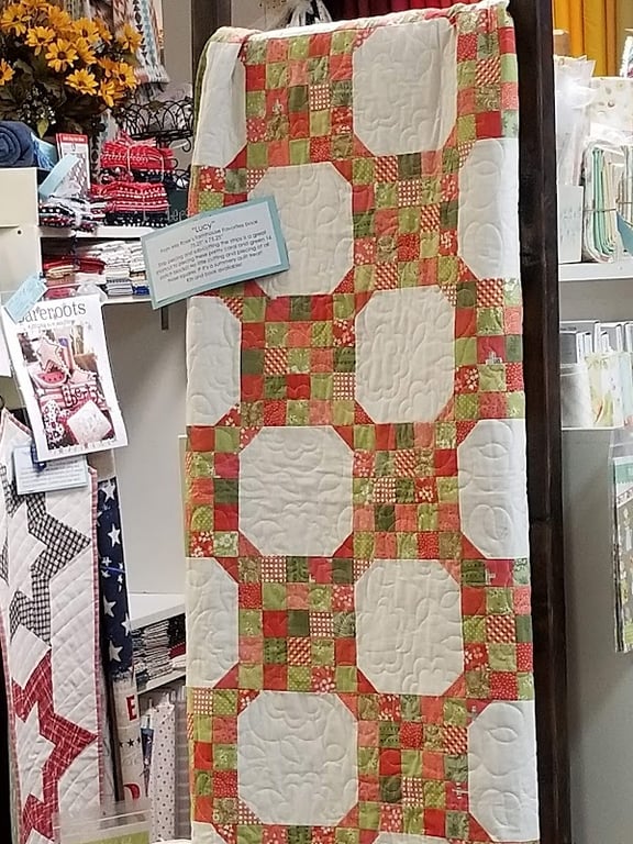 A colorful quilt featuring a patchwork design with various fabrics is displayed in the Dutch Rose Quilt Shop.
