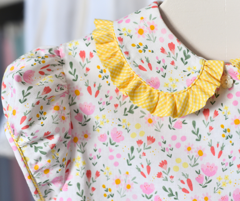 The image features a close-up of a floral-patterned fabric dress with a yellow gingham ruffled collar, showcasing vibrant colors and intricate details.
