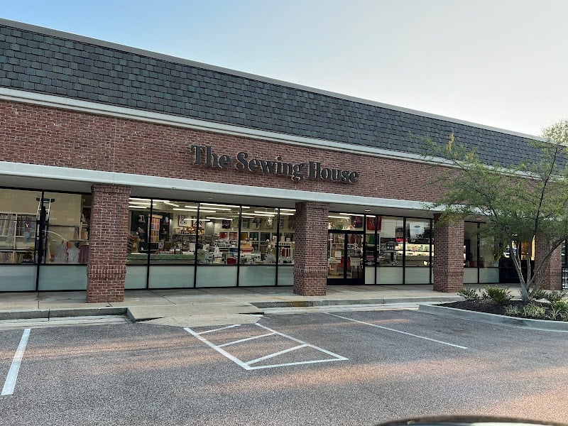 The image shows the exterior of The Sewing House, a sewing store with large windows displaying various fabrics, sewing machines, and supplies.