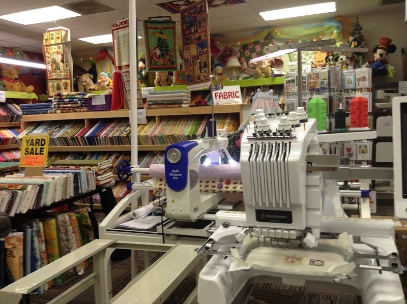 A vibrant sewing store interior features various sewing machines displayed on tables, surrounded by colorful fabrics and quilting supplies.