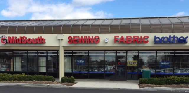 MidSouth Sewing and Fabric features a bright storefront with large signage highlighting sewing and fabric products.