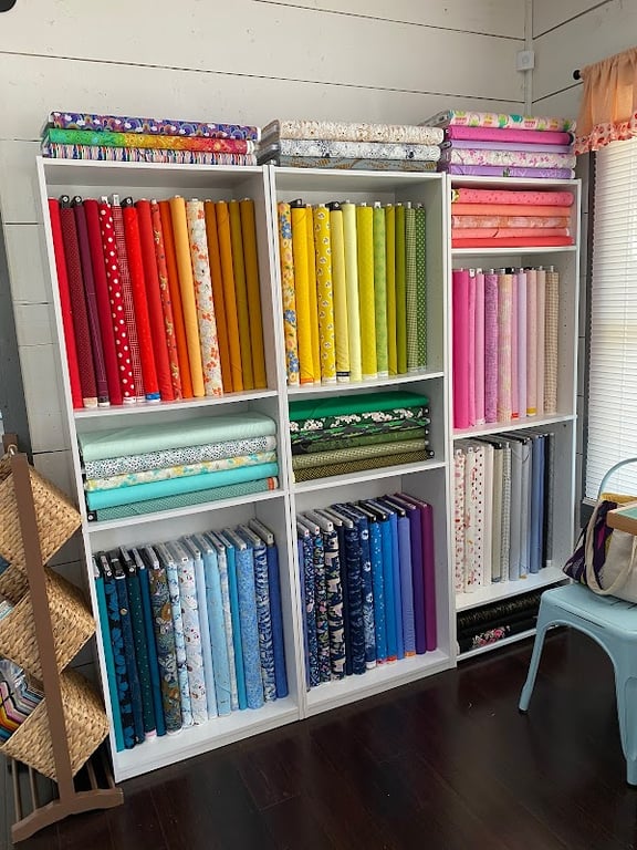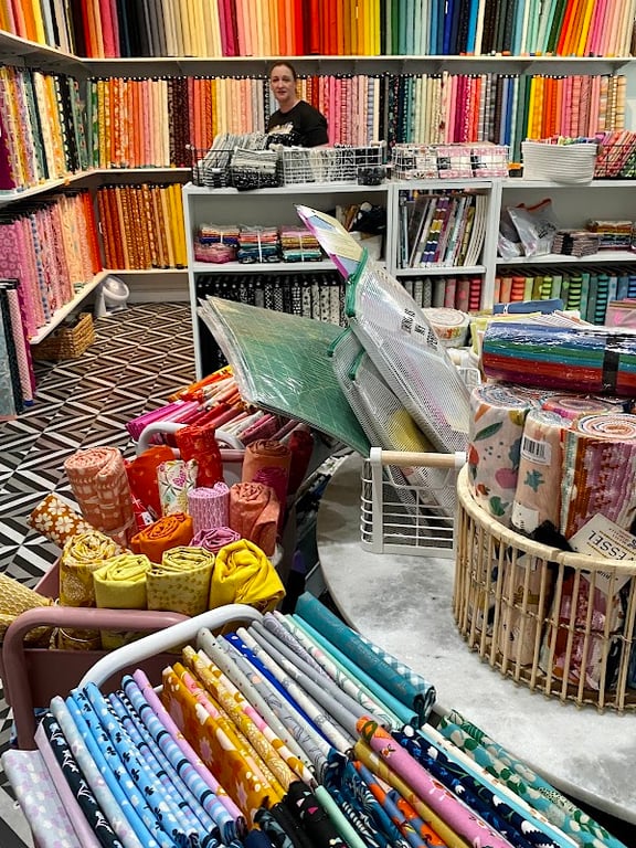 The Beehive Craft Studio features vibrant shelves filled with colorful fabrics and sewing supplies.
