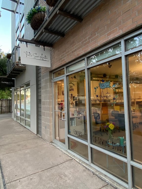That's Sew Austin is a sewing store featuring large windows displaying a cozy interior with sewing machines, colorful fabrics, and a welcoming atmosphere for classes and co-sewing