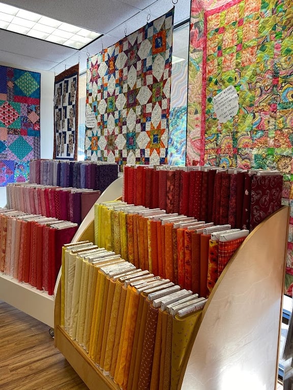 Colorful bolts of fabric line the shelves in Quilter's Quarters, showcasing various patterns.