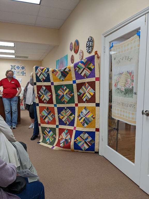 A colorful quilt featuring a patchwork design is displayed prominently in a sewing store, surrounded by customers engaged in conversation.