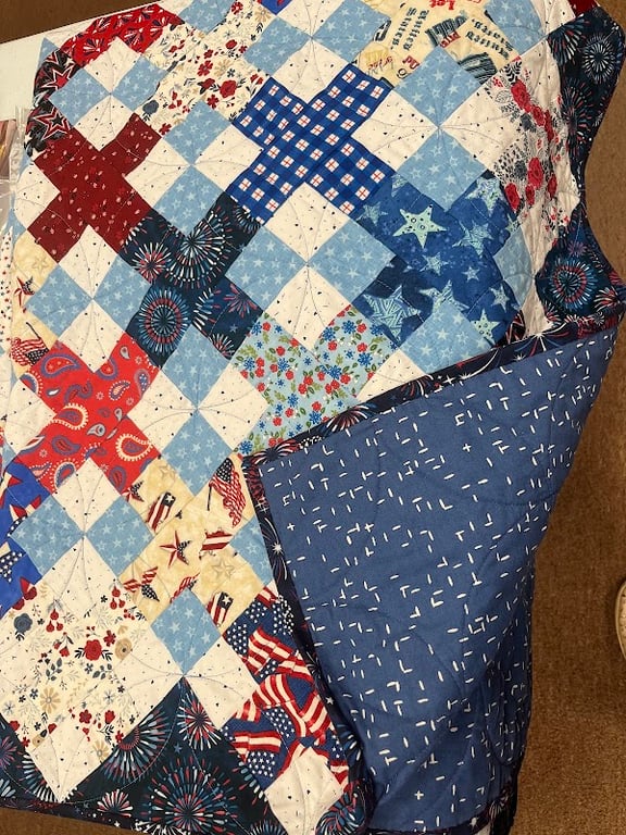 A vibrant quilt featuring a patchwork of red, blue, and white fabrics is displayed prominently, showcasing intricate patterns and textures.