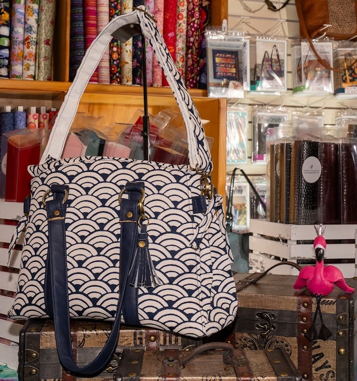 A stylish fabric bag with a wave pattern is prominently displayed in Quilter's Quarters, surrounded by colorful rolls of fabric and various sewing supplies.