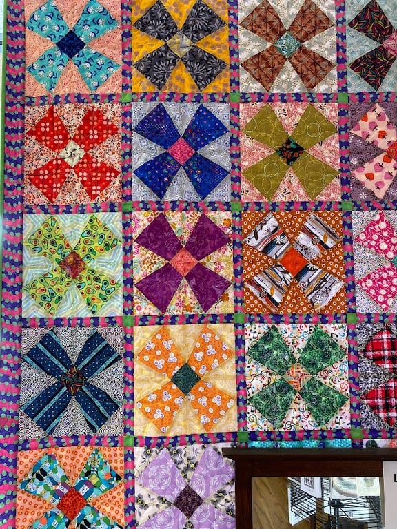 A vibrant quilt featuring a variety of colorful patterns and fabrics is prominently displayed on the wall of Quilter's Quarters.