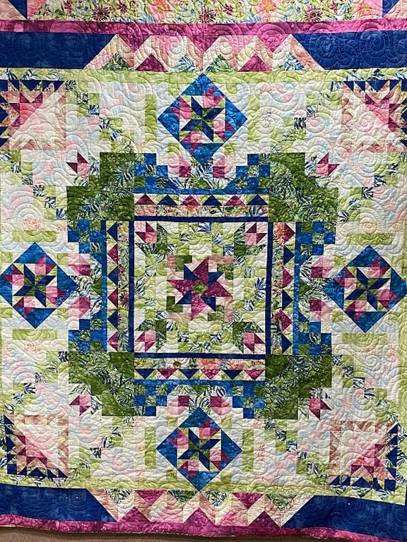 A vibrant quilt features intricate patterns in shades of green, pink, and blue, showcasing the artistry of quilting.
