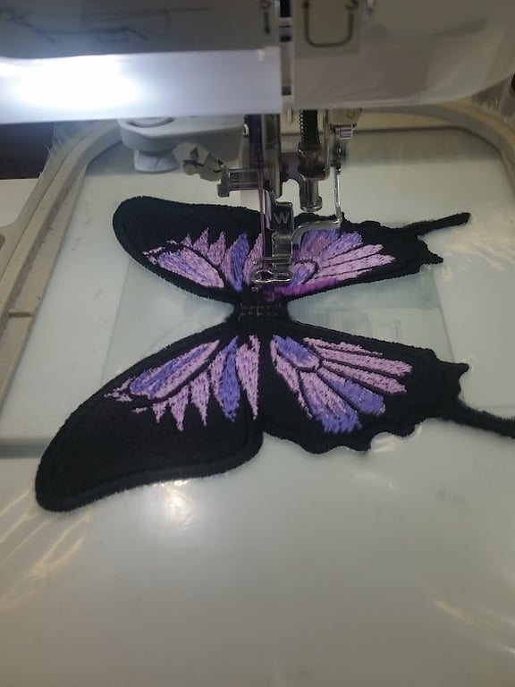 The image shows an embroidery machine stitching a vibrant butterfly design with purple and black details.