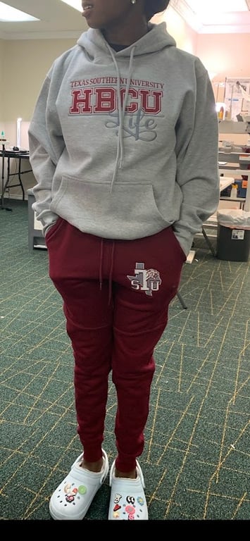 The image features a gray hoodie with embroidered text reading "Texas Southern University HBCU Life" in red and gray.