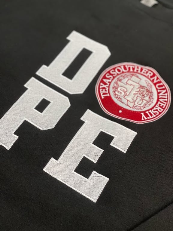 The image features a close-up of a black sweatshirt displaying the word "DOPE" in large white letters, accompanied by a red Texas Southern University emblem.
