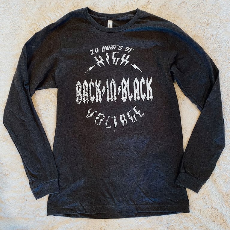 A long-sleeve black shirt featuring a graphic design celebrating "20 Years of Back in Black Voltage" is displayed on a soft, light-colored surface.
