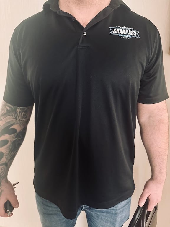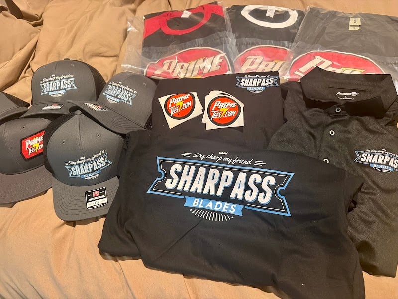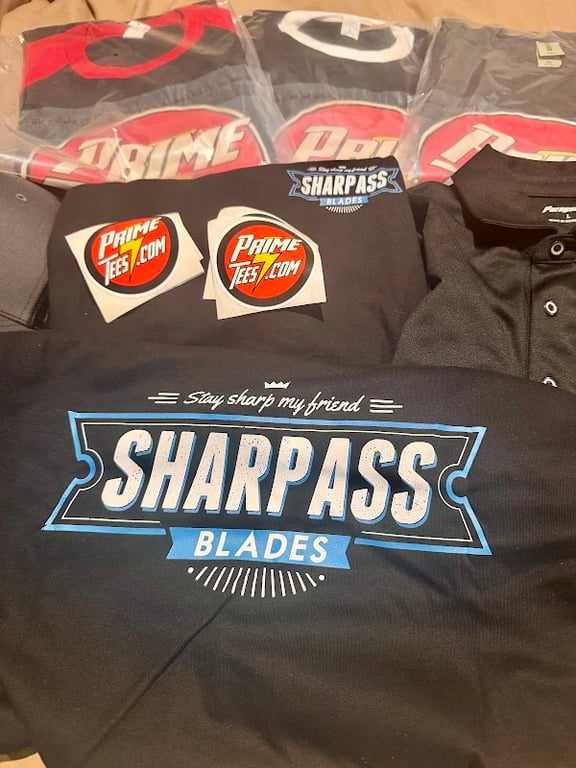 The image features various branded apparel from PrimeTees.com, including t-shirts and a polo shirt, alongside stickers and a prominent "Sharpass Blades" logo.