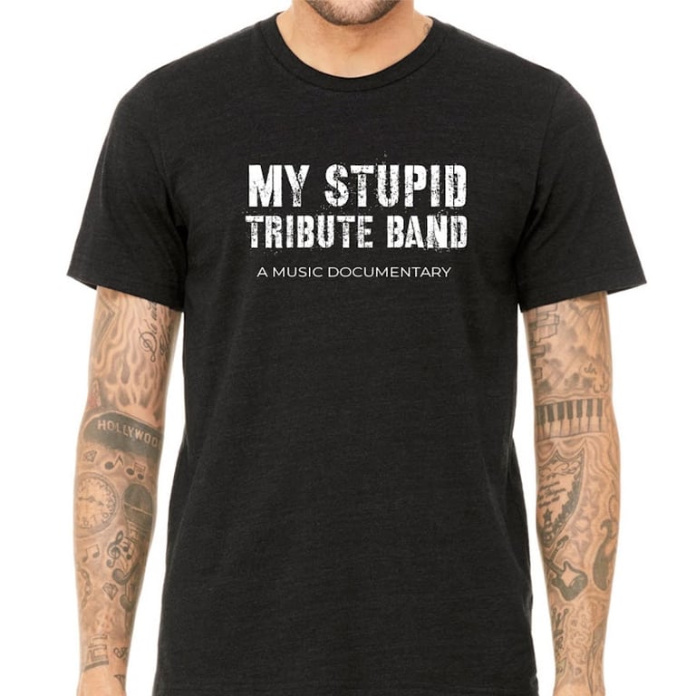 A person wearing a black t-shirt with the text "MY STUPID TRIBUTE BAND" stands prominently. The shirt features a casual style, suitable for music enthusiasts.