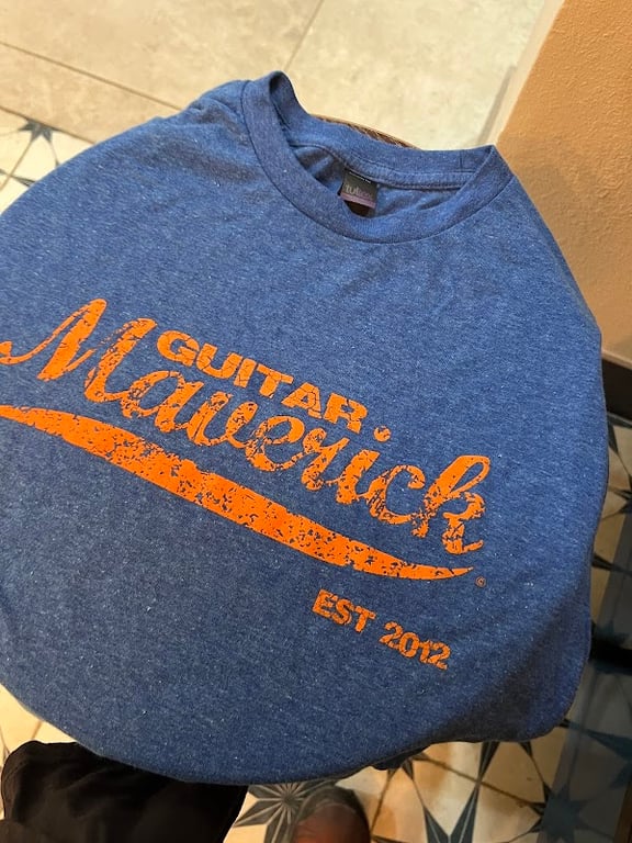 A blue T-shirt featuring the text "Guitar Maverick" in orange is displayed on a table.
