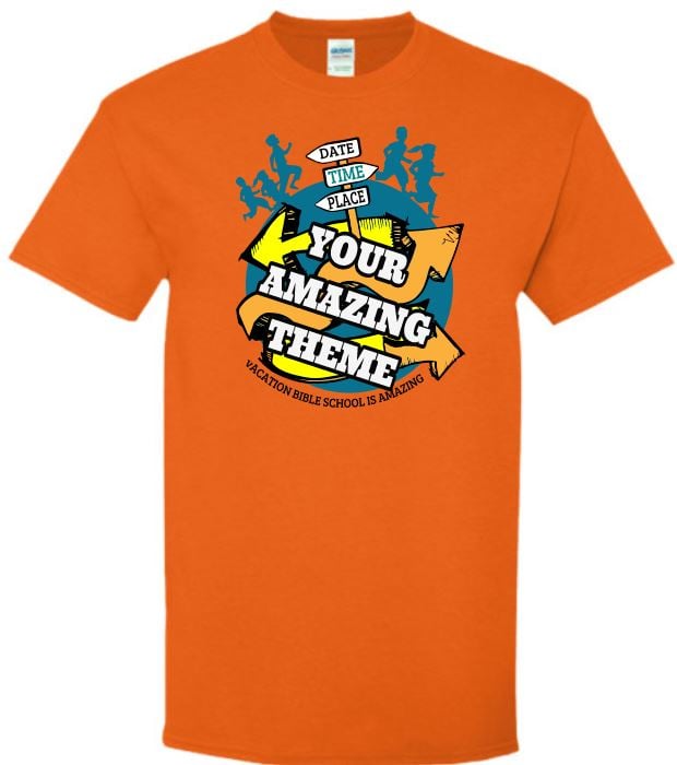 The image features a vibrant orange t-shirt with a playful graphic design, showcasing a customizable theme for a Vacation Bible School.