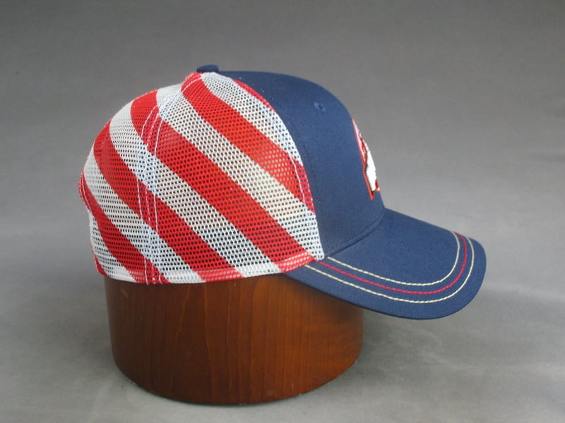 A blue baseball cap with red and white striped mesh panels is displayed on a wooden stand.