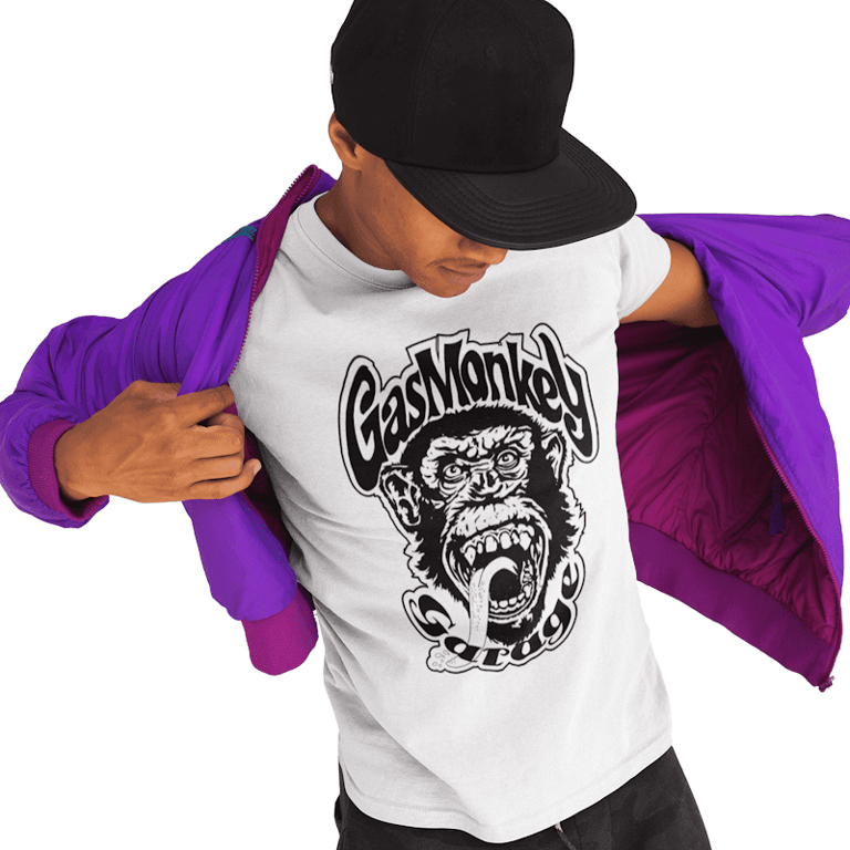 A person is wearing a white t-shirt featuring a bold graphic of a monkey, while showcasing a vibrant purple jacket.