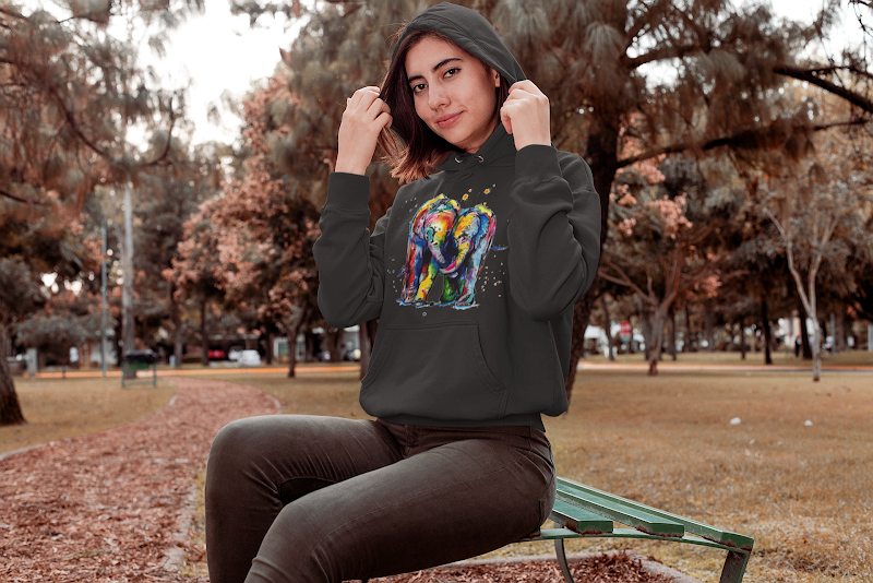 The image features a young woman wearing a colorful elephant-printed hoodie, sitting on a park bench surrounded by trees.
