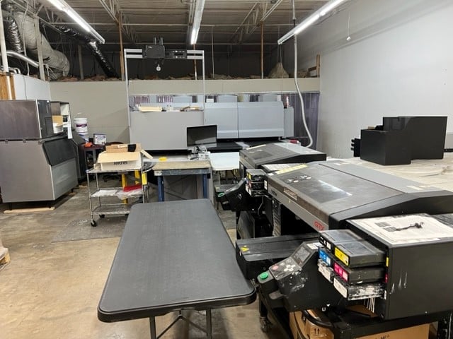 The image shows the interior of Promo Planet, a sewing store, featuring a workspace with sewing machines, a large printer, and various tools.