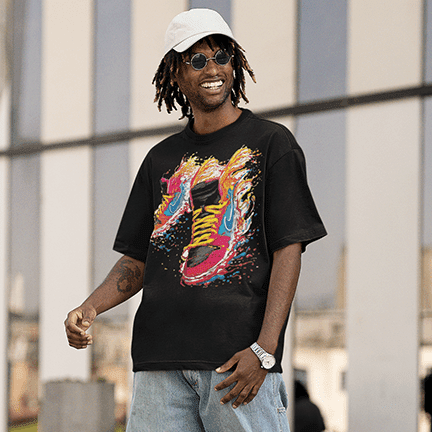 The image features a smiling individual wearing a colorful graphic t-shirt and a cap, standing outdoors against a modern building backdrop.
