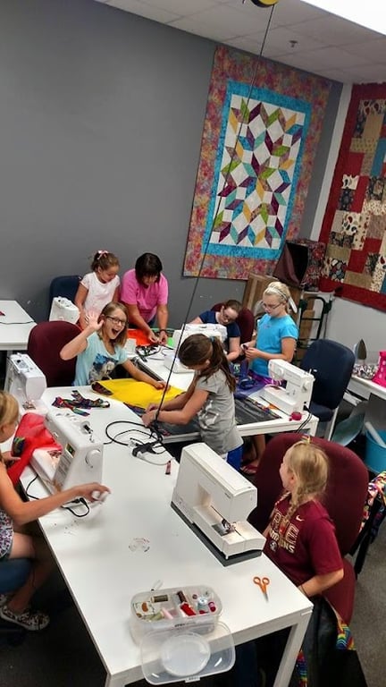 A group of children is engaged in a sewing class at Suddenly Sewing, surrounded by sewing machines and colorful fabrics.