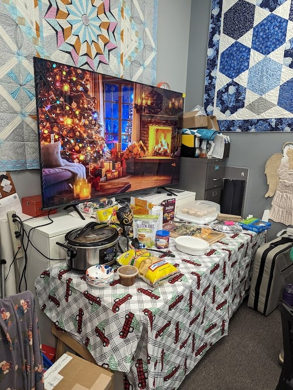 A cozy sewing store features a table covered with a festive tablecloth, displaying snacks and a slow cooker. Colorful quilts hang on the walls, enhancing the inviting atmosphere.
