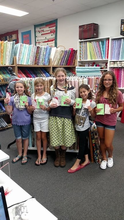 Five children proudly display their completed sewing projects in a vibrant sewing store filled with colorful fabrics on shelves.